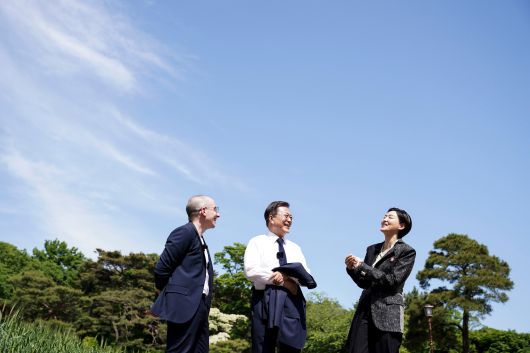 문재인 대통령이 지난 12일 청와대에서 배우 박진희, 방송인 타일러 라쉬와 ‘P4G 서울 정상회의' 특별 대담을 하고 있다. 문 대통령은 대담에서 "제가 인생을 다시 산다면 나무를 전문으로 삼거나, 또는 농사를 지으며 자유롭게 살고 싶다”고 말했다. 이 대담 영상은 회의 개막 사흘을 앞둔 27일 공개됐다. /청와대 |