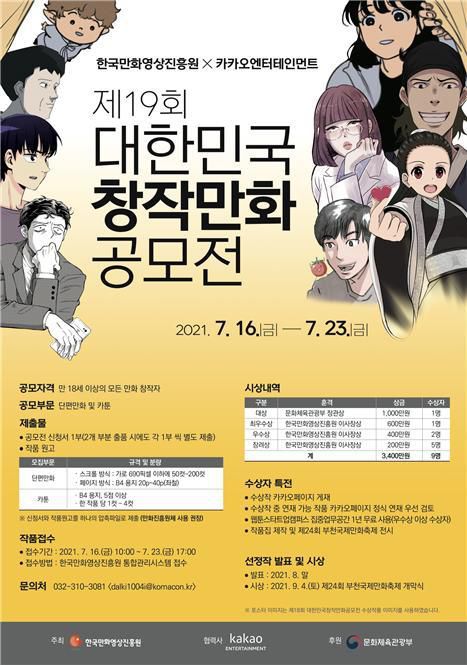 만 18세 이상 만화 창작자라면 누구나 참여할 수 있고, 자유 주제로 단편만화 부문과 카툰 부문의 응모작을 모집한다. 작품 접수 기간은 오는 7월 16~23일이다.