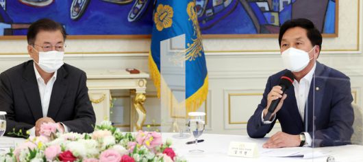 김기현 국민의힘 대표 권한대행(오른쪽)이 지난 26일 청와대에서 열린 문재인 대통령(왼쪽)과 여야 5당 대표 초청 대화에 참석해 발언하고 있다. 뉴시스 |