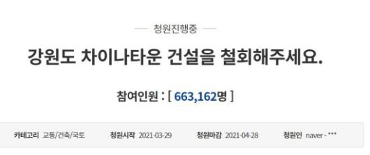 67만명의 국민이 동의한 이 청원은 강원도 한중문화타운이 '차이나타운'이라며 반대 뜻을 밝혔고, '춘천 중도선사 유적지에 외국인을 위한 호텔을 건설하는 것도 반대'한다고 주장했다.