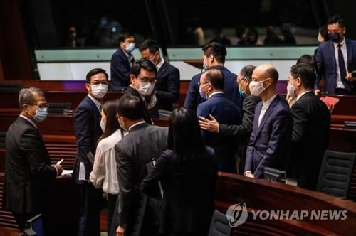 선거제 개편안 통과 자축하는 홍콩 입법회 의원들 |