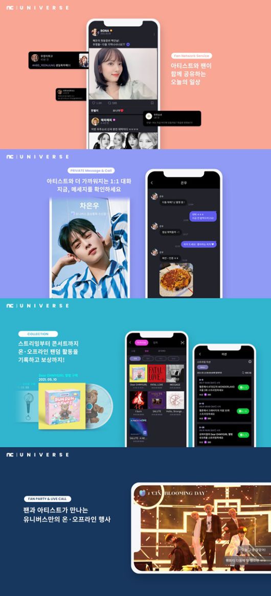 2021년 1월 출시된 유니버스는 엔씨소프트에서 개발, 운영을 담당하고 있다. 강다니엘, 더보이즈, 몬스타엑스, 박지훈, CIX, 아스트로, IZ*ONE, (여자)아이들, 우주소녀, AB6IX, 에이티즈으로 론칭한 유니버스는 2021년 5월 현재 오마이걸, 위아이, 크래비티, 브레이브걸스, 드리핀까지 총 16팀의 아티스트가 입점돼있다.