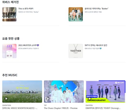2019년 9월 서비스를 시작한 위버스는 하이브의 자회사 위버스컴퍼니에서 운영하고 있는 소셜 네트워크 서비스다. 초기에는 방탄소년단, 여자친구, 투모로우바이투게더 등 하이브 소속 아티스트 중심으로 시작됐지만 현재는 다른 소속 아티스트도 찾아볼 수 있다. 세븐틴, 뉴이스트, 엔하이픈, CL, 피원하모니, 위클리, 선미, 드림캐처, 트레저 등이 입점돼있다.