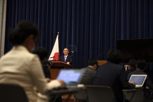 스가 요시히데 일본 총리가 28일 총리 관저에서 열린 기자회견에서 취재진 질문에 답하고 있다.[AP] |