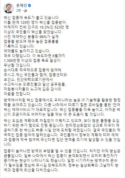 문 대통령은 이날 페이스북에 "백신 접종에 속도가 붙고 있다"며 이같이 밝혔다. 이어 "사전 예약하신 분들의 98%가 실제 접종을 받으며 매우 높은 접종률을 기록하고 있고 예약률도 높아지고 있다"고 전했다.