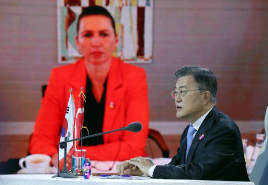 문재인 대통령이 30일 오후 서울 동대문디자인플라자(DDP)에서 열린 메테 프레데릭센 덴마크 총리와의 한-덴마크 화상 정상회담에서 인사말을 하고 있다.(사진=연합뉴스) |
