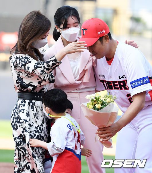 나지완이 아내와 아들, 장모의 축하를 받고 있다. 2021.05.30 /jpnews@osen.co.kr
