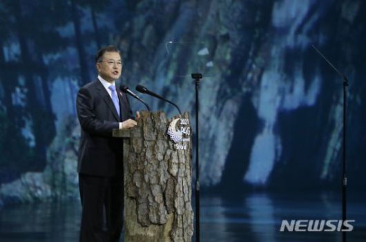 문재인 대통령이 30일 오후 서울 동대문디자인플라자(DDP)에서 열린 ‘P4G 서울 녹색미래 정상회의’ 개회식에 참석해 연설을 하고 있다. 2021.05.30. [뉴시스] |