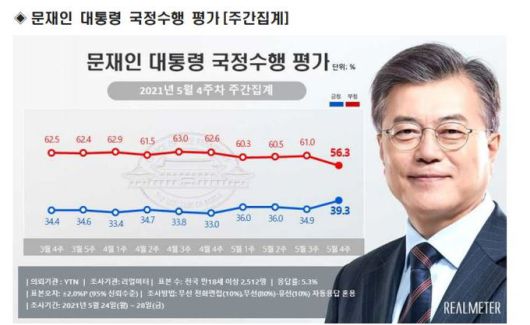 여론조사기관 리얼미터가 YTN 의뢰로 지난 24∼28일 문 대통령에 대한 국정수행 평가를 물은 결과 39.3%가 긍정 평가했다. 지난주보다 4.3%포인트 상승한 수치다. LH 사태 이전인 3월 첫째주 40.1% 수준에 근접한 수치다. 부정 평가는 56.3%로 4.7%포인트 내려갔다. 문 대통령 부정평가가 60% 아래로 떨어진 것도 11주(3월 둘째주 57.4%) 만이다. 긍·부정 격차는 19.7%포인트다. 한·미 정상회담에서의 성과가 지지율로 이어졌다는 분석이 나온다.