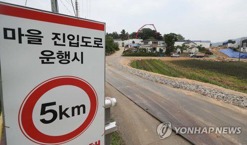 이날 오후 평산마을은 레미콘 차량과 바위 등을 옮기는 대형 트럭이 공사장을 드나들었지만, 여느 농촌 마을처럼 조용했다.