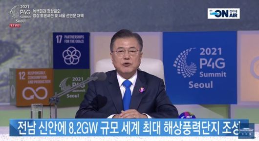 문 대통령은 또, "한국은 그린 뉴딜을 국가 역점 사업으로 추진하고, 2025년까지 650억 불 규모의 재정을 투입하려고 한다. 민간의 활발한 참여를 이끌고 혁신 노력을 뒷받침하는 것에 정책의 주안점을 두고 있다"라며 "이미 구체적인 성과들이 나타나고 있다. 한국 해양 생태계의 보고인 전라남도 신안에서는 지역주민과 지자체, 기업, 노동계가 힘을 모아 8.2GW(기가와트) 규모의 세계 최대 해상풍력단지 조성에 나섰다"고 설명했다.