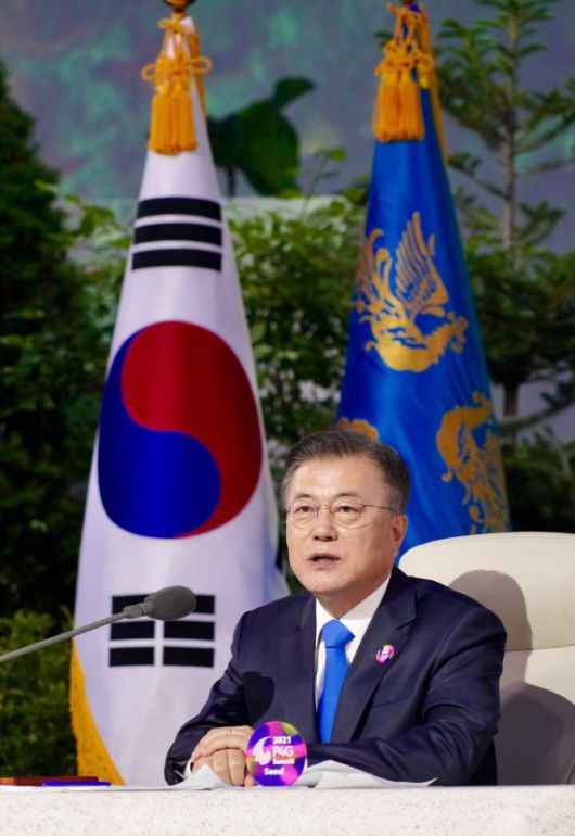 (서울=뉴스1) 이광호 기자 = 문재인 대통령이 지난달 31일 서울 동대문디자인플라자(DDP)에서 열린 P4G 서울 녹색미래 정상회의 정상토론세션에서 의제 발언을 하고 있다. 2021.6.1/뉴스1 /사진=뉴스1화상 |