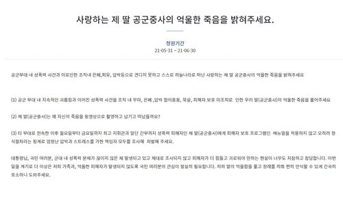 한편 이번 사안과 관련해 전날 청와대 국민청원 게시판에는 '사랑하는 제 딸 공군중사의 억울한 죽음을 밝혀주세요'라는 제목의 청원이 올라왔다. 피해자 유족으로 추정되는 청원인은 "공군 부대 내 지속적인 괴롭힘과 이어진 성폭력 사건을 조직 내 무마, 은폐, 압박 합의종용, 묵살, 피해자 보호 미조치로 인한 우리 딸(공군중사)의 억울한 죽음을 풀어달라"고 호소했다. 해당 청원에는 게시 하루 만인 이날 오전 10시 30분 현재 15만5,000여명이 동의했다.