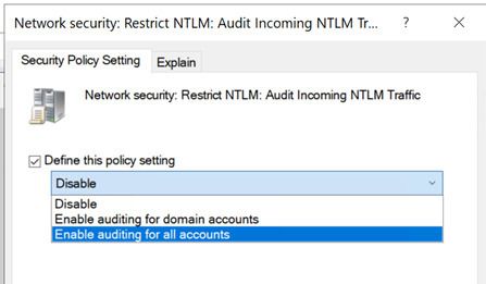 이제 ‘Network Security: Incoming NTLM traffic’ 대신 먼저 감사를 하는 정책을 설정한다. 이는 서버 2008 R2 이상에서 지원된다. 2가지 정책이 있다. 먼저 'Network Security: Restrict NTLM: Audit incoming NTLM Traffic'을 활성화한다. 이후 ‘Enable auditing for domain accounts'나 'Enable auditing for all accounts'를 선택한다.