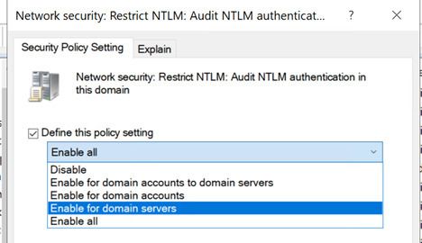 ‘Network security: Restrict NTLM: Audit NTLM authentication in this domain’도 활성화한다. 이 설정에서 ‘Enable for domain accounts to domain servers’, ‘Enable for domain accounts’, ‘Enable for domain servers’, 또는 ‘Enable all’을 선택할 수 있다.