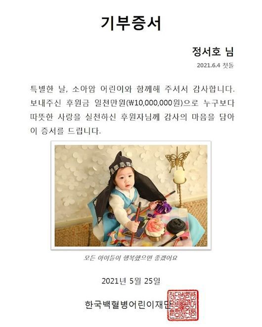 이어 “일년 동안 서호가 받은 큰 사랑이 아픈 아이들에게도 전해지길 바라요. 모든 아이들이 아프지 않고 밝고 건강하게 웃을 수 있길 기도합니다”고 덧붙였다.