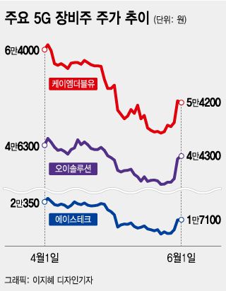 실제 케이엠더블유는 지난해 9월 주가가 8만원대 후반에서 약 9개월 뒤인 현재는 5만4200원에 머물러 있다. 한때 5위권에 진입했던 코스닥 시가총액 순위 역시 18위까지 밀렸다. 다른 5G 관련 종목 역시 대부분 30~40%에 달하는 하락 폭을 기록하고 있다.