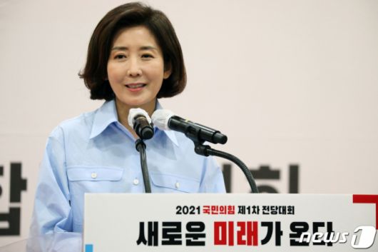 국민의힘 제1차 전당대회 광주·전북·전남·제주 합동연설회가 열린 30일 오후 광주 서구 치평동 김대중컨벤션센터에서 나경원 당 대표 후보가 발언하고 있다. /사진=뉴스1 |