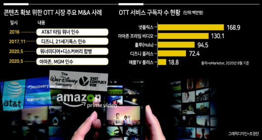 여기에 실리콘밸리의 ‘IT 공룡’들이 OTT 시장을 향한 야심을 드러내면서 또 다른 지각변동을 예고하고 있다. 아마존은 최근 헐리우드의 대표적인 영화제작사 MGM 스튜디오를 84억5000만달러(9조5000억원)에 인수한다고 밝혔다. 마찬가지로 MGM이 가진 오리지널 콘텐츠를 흡수함으로써 자사의 OTT인 아마존 프라임 비디오 서비스를 강화하기 위한 목적이다.