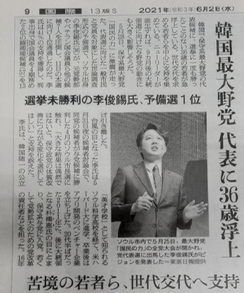 아사히신문은 이날 국제면에 “한국 최대 야당에서 36세 이준석씨가 대표 후보로 급부상했다”며 “어려움에 처한 청년층이 세대 교체를 기대하고 있다”는 제목의 기사를 실었다.