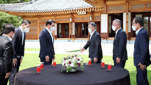 문 대통령은 이날 정오 청와대 상춘재에서 정의선 현대자동차그룹 회장과 최태원 SK그룹 회장, 구광모 LG그룹 회장, 김기남 삼성전자 부회장과 오찬 회동을 하고 이같이 말했다. 문 대통령의 방미 당시 4대 그룹이 400억달러(약 44조원) 규모 대미(對美) 투자계획을 발표하면서 한미정상회담을 측면 지원한 점을 격려한 것이다.
