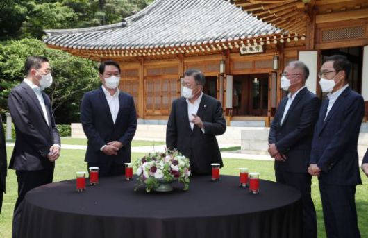 [아시아경제 이지은 기자] 문재인 대통령이 4대 그룹 대표를 청와대로 불러 오찬을 함께하고 "코로나 위기 극복과 한미 정상회담의 풍부한 성과에 4대 그룹의 역할이 컸다"고 치하했다. 최태원 SK회장은 "한미정상회담 결과는 역대 최고"라고 답했다. 이날 참석자들은 이재용 삼성전자 부회장 사면을 건의했고, 문 대통령은 "고충을 이해한다"고 답했다.