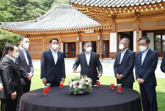 문 대통령은 이날 4대그룹 대표들을 만나 "우리 경제가 코로나19 위기로부터 빠르게 회복하고 재도약하는데 4대그룹 역할이 컸다. 한미정상회담의 성과가 그 어느 때보다 풍부하다"며 "지금까지 미국과 수혜적 관계였다면 첨단 분야에서 글로벌 공급망 도움 주는 동반자적 관계가 됐고, 그 과정에서 4대 그룹의 기여가 컸다"고 강조했다.