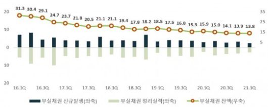 정리된 부실채권은 2조7000억원으로 전분기보다 7000억원 줄었다. 일반적으로 부실채권 정리규모는 4분기에 늘었다가 1분기에 줄어드는 경향을 보인다.