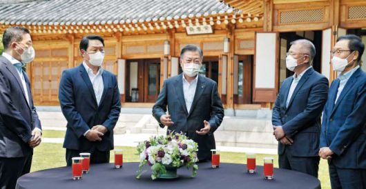 문 대통령은 이날 청와대 상춘재로 최태원 SK 회장 등 4대 그룹 대표를 초청해 1시간 30분 동안 오찬을 겸한 간담회를 했다. 문 대통령이 취임 후 4대 그룹 대표와 만난 건 이번이 처음이다. 최 회장을 비롯해 정의선 현대차그룹 회장, 구광모 LG 회장, 김기남 삼성전자 부회장이 참석했다. 앞서 4대 그룹은 지난달 21일 미국 워싱턴에서 열린 한미 정상회담을 계기로 44조원의 대미 투자 계획을 밝혔고, 이에 대해 조 바이든 미 대통령과 문 대통령 모두 감사의 뜻을 전했다. 이날 오찬에 대해 청와대는 “문 대통령의 진심 어린 감사를 전하기 위해 마련했다”고 밝혔다.