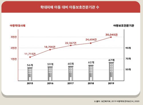 전국 아동보호전문기관은 2015년 56곳에서 2019년 67곳으로 4년간 11곳이 늘어나는 데 그쳤다.