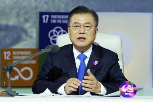 문재인 대통령이 지난 달 31일 오후 서울 동대문디자인플라자에서 열린 'P4G 서울 녹색미래 정상회의' 정상토론세션에 참석해 의제 발언을 하고 있다. 뉴시스 제공 |