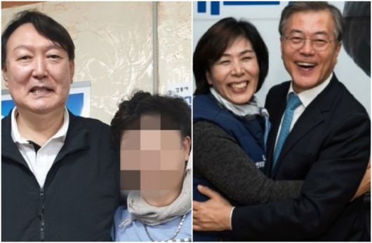 윤석열 전 검찰총장이 음식점 사장과 기념사진을 찍고 있는 모습(왼쪽사진)과 지난 2016년 총선때 최민희 후보를 지지하기 위해 선거 사무소를 찾은 당시 의원 신분이었던 문재인 대통령. [연합·인터넷 캡처] |