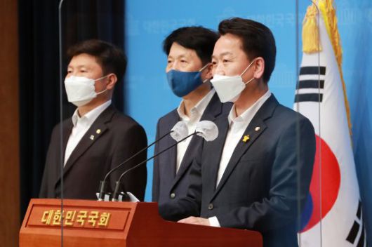 더불어민주당 초선 의원 모임 '더민초'의 운영위원장인 고영인 의원(오른쪽 첫 번째)이 3일 오후 서울 여의도 국회 소통관에서 문재인 대통령과의 간담회 결과를 발표하고 있다. 뉴스1 /사진=뉴스1화상 |