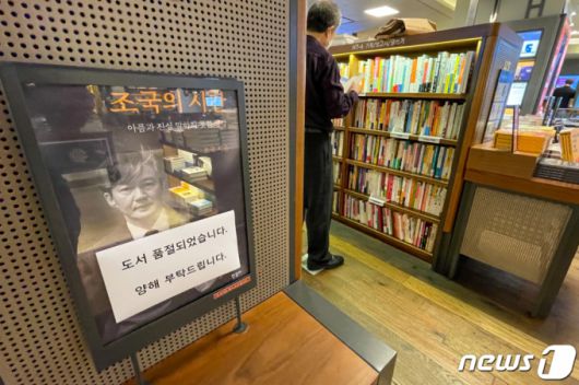 2일 서울 종로구 교보문고 광화문점에 조국 전 법무부 장관의 회고록 '조국의 시간' 품절 안내문이 붙어있다. /사진=뉴스1 |