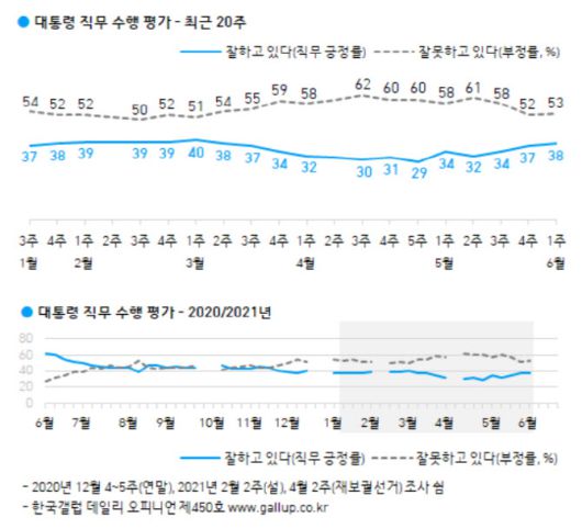 여론조사 전문기관 한국갤럽이 지난 1~3일 전국 만 18세 이상 1003명을 대상으로 6월 1주차 문 대통령의 직무 수행평가를 조사해보니, 긍정률이 38%로 전주 대비 1%포인트 상승한 것으로 나타났다. 5월 2주차 32%에서 3주차 34%, 4주차 37%, 6월 1주차 38%로 3주 연속 상승한 것이다.