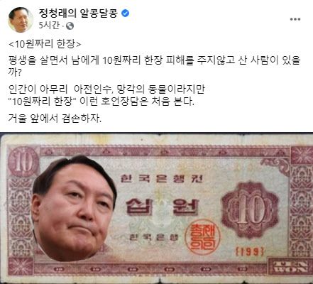 이어 “‘전 재산 29만 원’이라는 전두환이나 ‘10원 한 장 피해 준 적 없다’는 윤 전 총장이나 그분이 그분이다”며 전두환 전 대통령을 29만원짜리 지폐, 윤 전 총장을 10원짜리 지폐 등장인물로 그린 합성 사진을 공유했다.