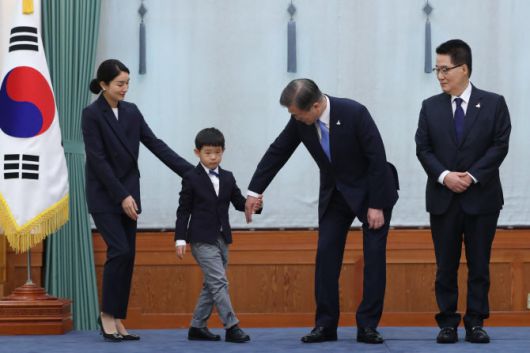 문재인 대통령이 지난해 7월 29일 청와대에서 박지원 신임 국가정보원장에게 임명장을 수여한 뒤 박 원장의 딸, 손자와 기념촬영을 하고 있다. (사진=연합뉴스) |