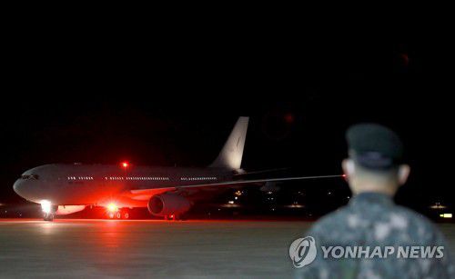 (성남=연합뉴스) 김서영 기자 = 미국 정부가 제공한 존슨앤드존슨사(社)의 신종 코로나바이러스 감염증(코로나19) 얀센 백신을 실은 군용 수송기가 5일 자정 직후 어둠을 뚫고 경기도 성남 서울공항 상공에 모습을 드러내자 현장에 대기 중이던 한미 양국 관계자들 사이에서 박수가 터져 나왔다.