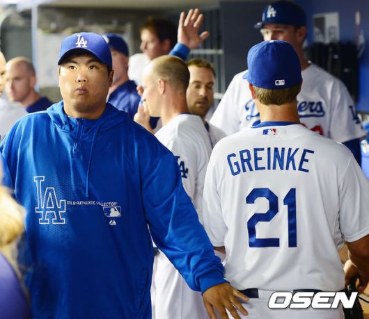 [OSEN=로스앤젤레스, 민경훈 기자] 다저스 시절 덕아웃에서의 류현진과 잭 그레인키. rumi@osen.co.kr |