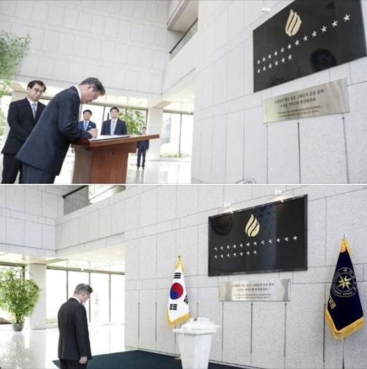문재인 대통령이 지난 4일 오후 국가정보원에서 업무 중 순직한 국정원 직원을 기리는 '이름없는 별' 추모석에 묵념하고 있다. /사진제공=탁현민 페이스북 캡처 |