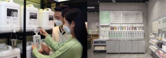 6일 관련업계에 따르면 아모레퍼시픽그룹은 공병 캠페인을 펼치고 있다. 2003년 ‘이니스프리 공병 수거 캠페인’을 시작으로 작년까지 전국 아모레퍼시픽그룹 매장에서 수거한 공병만 2200t에 달한다. 플라스틱 화장품 공병은 매장용 바닥재와 집기로도 활용하고 있다. 지난해 10월부터는 리필 스테이션도 운영 중이다. 아모레스토어 광교에 위치한 리필 스테이션에서는 샴푸와 바디워시 제품의 내용물을 원하는 만큼 소분해 판매한다. 1000명이 넘는 소비자가 리필 제품을 구매했다. 아모레퍼시픽은 앞으로 리필 제품의 가짓수를 확대해 나갈 계획이다.