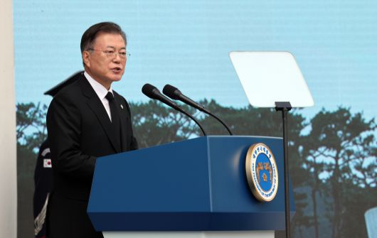 문재인 대통령이 6일 오전 서울시 동작구 국립서울현충원에서 열린 제66회 현충일 추념식에 참석, 추념사를 하고 있다. [연합] |
