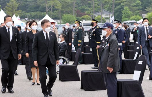 문재인 대통령이 6일 오전 서울시 동작구 국립서울현충원에서 열린 제66회 현충일 추념식에 참석하고 있다. (사진=연합뉴스) |