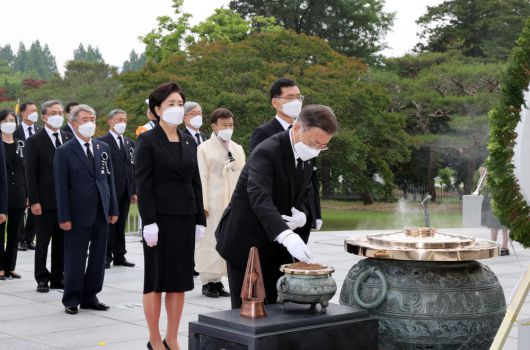 문재인 대통령이 6일 서울시 동작구 국립서울현충원에서 열린 제66회 현충일 추념식에 참석, 현충탑에서 분향하고 있다. |