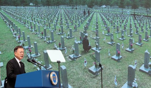 [서울=뉴시스]박영태 기자 = 문재인 대통령이 6일 서울 동작구 국립서울현충원에서 열린 제66회 현충일 추념식에 참석해 추념사를 하고 있다. 2021.06.06. since1999@newsis.com <저작권자ⓒ 공감언론 뉴시스통신사. 무단전재-재배포 금지.> /사진=뉴시스화상 |