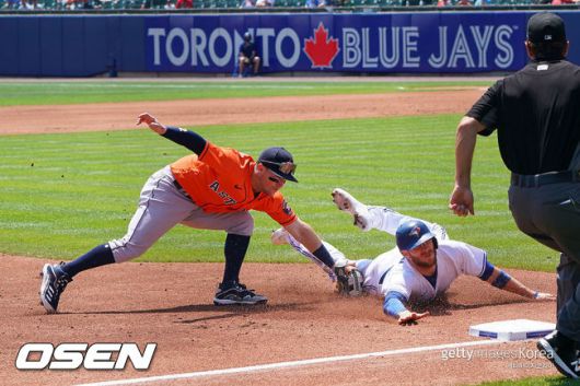 [사진] 토론토의 대니 잰슨이 7일(한국시간) 세일렌 필드에서 벌어진 휴스턴과의 경기 3회 말서 3루로 슬라이딩을 했지만 태그아웃되고 있다.ⓒGettyimages(무단전재 및 재배포 금지) |