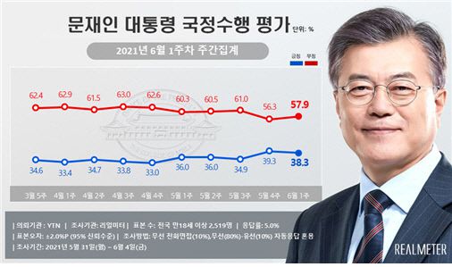 리얼미터가 YTN 의뢰로 지난달 31일부터 지난 4일까지 전국 18세 이상 2519명을 대상으로 조사한 결과, 문 대통령의 국정 수행에 대한 지지율(긍정 평가)은 38.3%로 지난주보다 1.0%포인트 하락했다. 부정 평가는 57.9%로 1.6%포인트 상승했다. 모름·무응답은 0.5%포인트 감소한 3.8%였다.