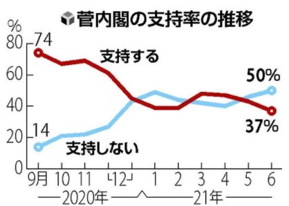 7일 일본 요미우리신문이 지난 4~6일 전국 유권자 1,070명(유효 답변자)을 대상으로 전화 여론조사를 벌인 결과, 스가 내각의 지지율은 37%로 나타났다. 이는 작년 9월 출범 이후 최저치로, 지난달 조사 결과(43%)에서 6%포인트나 하락한 것이다. 스가 내각이 출범한 직후인 작년 9월 조사 때(74%)와 비교하면 9개월 만에 지지율이 반 토막 났다.