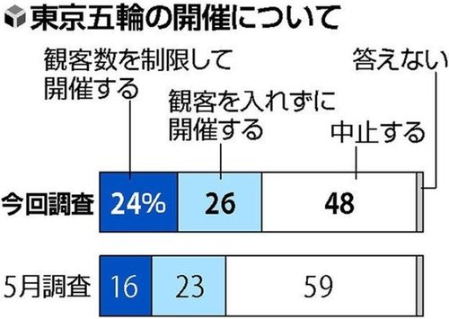 한편 코로나19 확산 상황에서 도쿄올림픽·패럴림픽을 개최하는 것에 대해서는 무관중(26%)이나 관중 수 제한(24%) 조건으로 개최하는 것이 좋다는 의견이 50%로 나타났다. 반면 ‘취소해야 한다’는 의견은 48%로 조사돼 조건부 개최에 찬성하는 여론이 근소한 차로 앞섰다. 취소를 주장하는 응답자 비율은 한 달 전 조사 결과(59%)와비교해 11%포인트나 하락했다. 이번 조사 결과는 지난달 아사히신문 여론 조사에서 43%가 ‘취소’, 40%가 ‘재연기’를 주장하는 등 80% 이상의 일본 국민이 올림피 개최에 반대한 것으로 나타난 결과와는 대비된다. 이 같은 결과에 대해, 내달 23일로 개막이 임박하며 개최할 수밖에 없다는 현실론이 퍼진 영향이라는 분석이 제기된다.