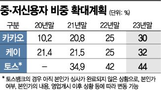 케이뱅크와 카카오뱅크가 2023년 말까지 목표로 정한 중·저신용자 비중은 각각 32%, 30%인데 반해 토스뱅크는 영업 첫 해 부터 30% 이상으로 설정, 2023년에는 44% 수준까지 끌어올린다는 계획이다. 토스 관계자는 "금융당국이 중·저신용자 대상 신용대출 비중 확대를 꾀하고 있어 토스의 앞선 신용평가 능력이 긍정적 평가를 받는데 역할을 할 것"이라고 했다.